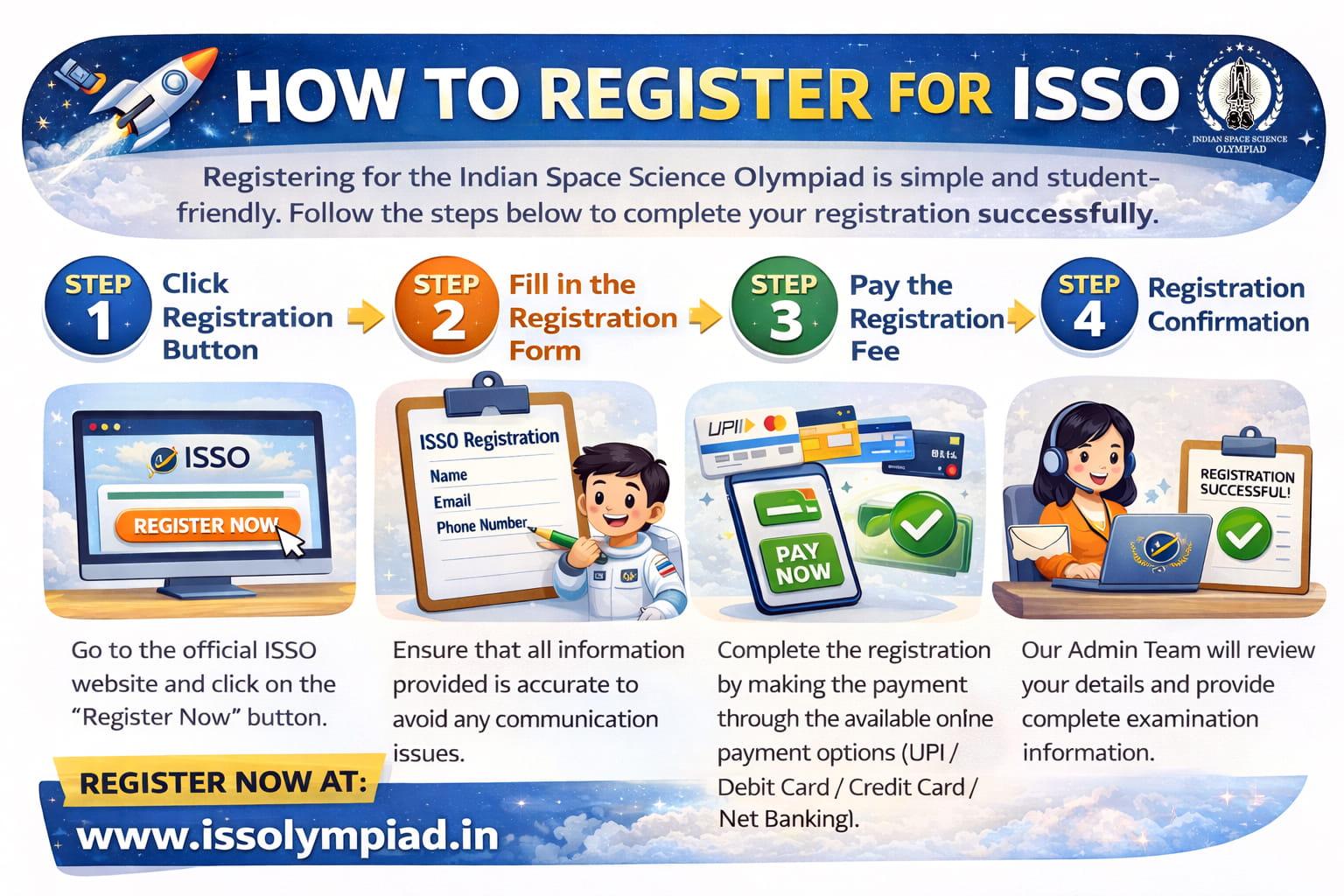 Registering for the Indian Space Science Olympiad (ISSO) 2026 is simple and student-friendly. Follow the steps below to complete your registration successfully.